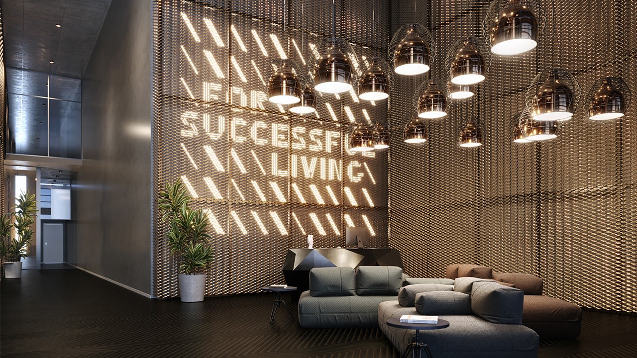 The steel pillars of the tower allow for pedestrians to flow beneath and around the building, creating an outdoor piazza for free expression of art and commerce, air and light. Overhead, neon structural beams form an iconic symbol that highlights the building’s uniqueness and gives a glimpse into the unconventional design found within.