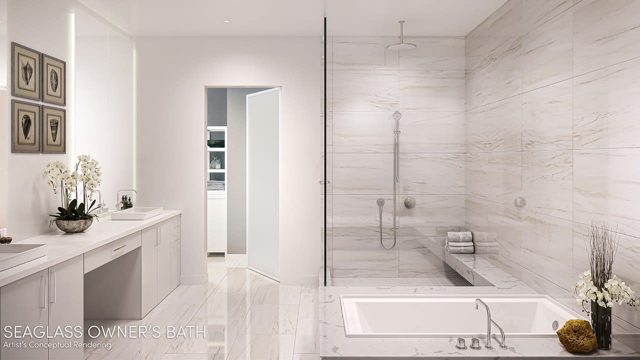 Lavish soaking tubs and separate semi-frameless shower enclosures (per plan) |